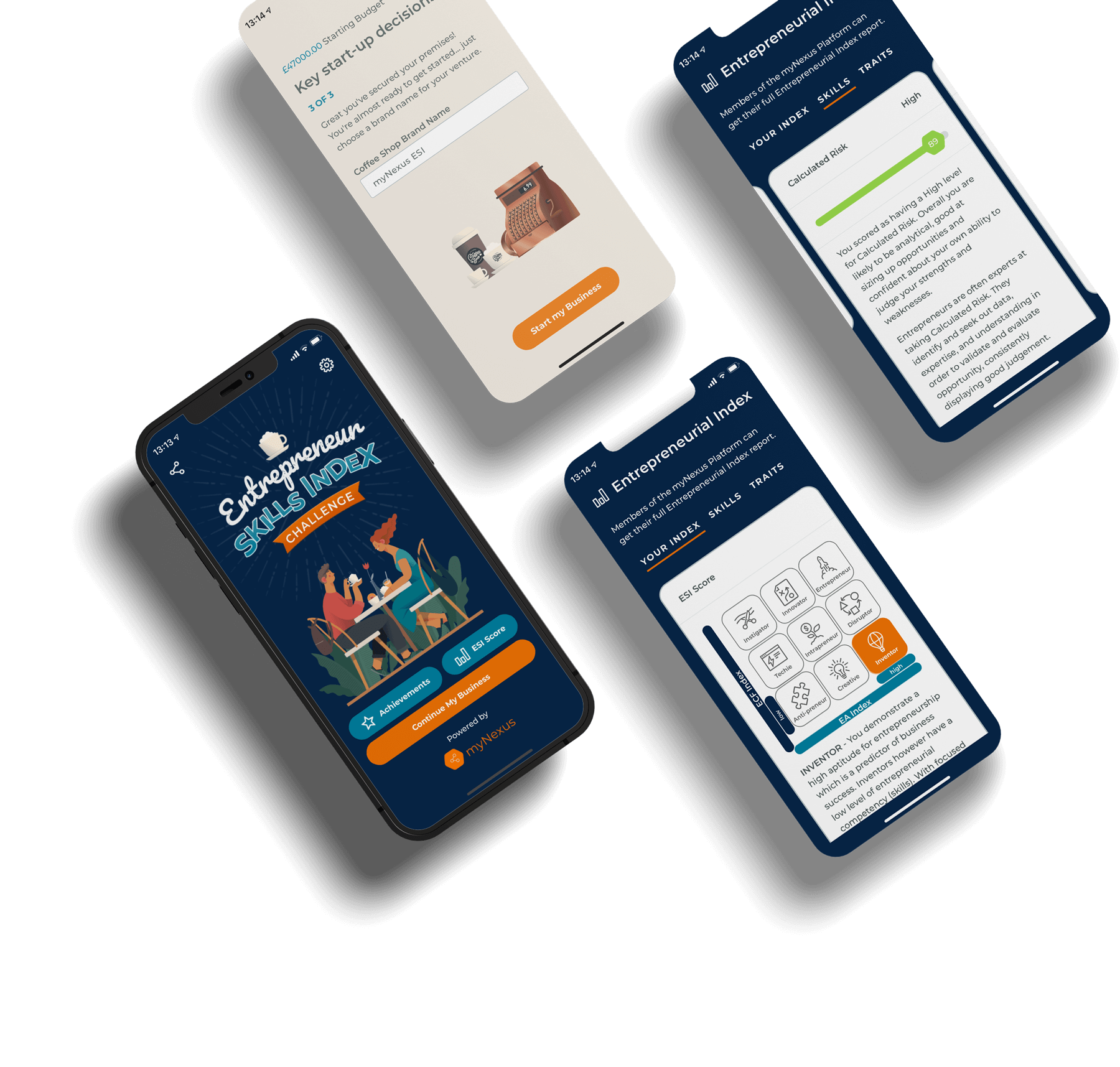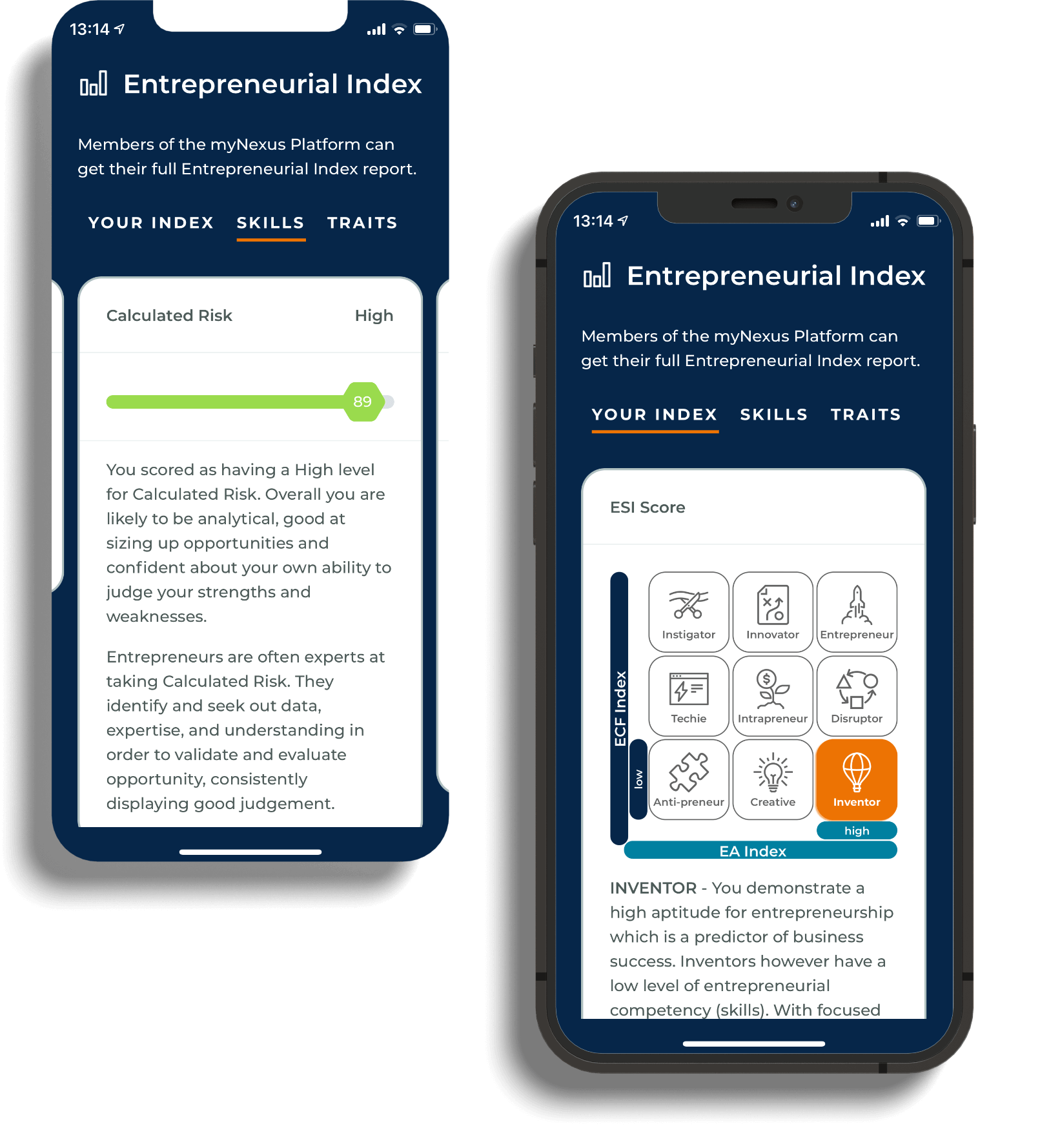 - Overview of your ESI Entrepreneur Type, two underpinning index scores, and nine different skills and traits.